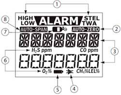 1 - Оповещение о тревоге, 2 - Автоматическая корректировка нулевой точки сенсора, 3 - Цифровое представление данных, 4 - Невидимый для пользователя режим, 5 - Указатель уровня заряда аккумулятора, 6 - Метки, определяющие тип газа, 7 - Баллон, наполненный газообразным веществом, 8 - Самостоятельная настройка диапазона чувствительности датчика.