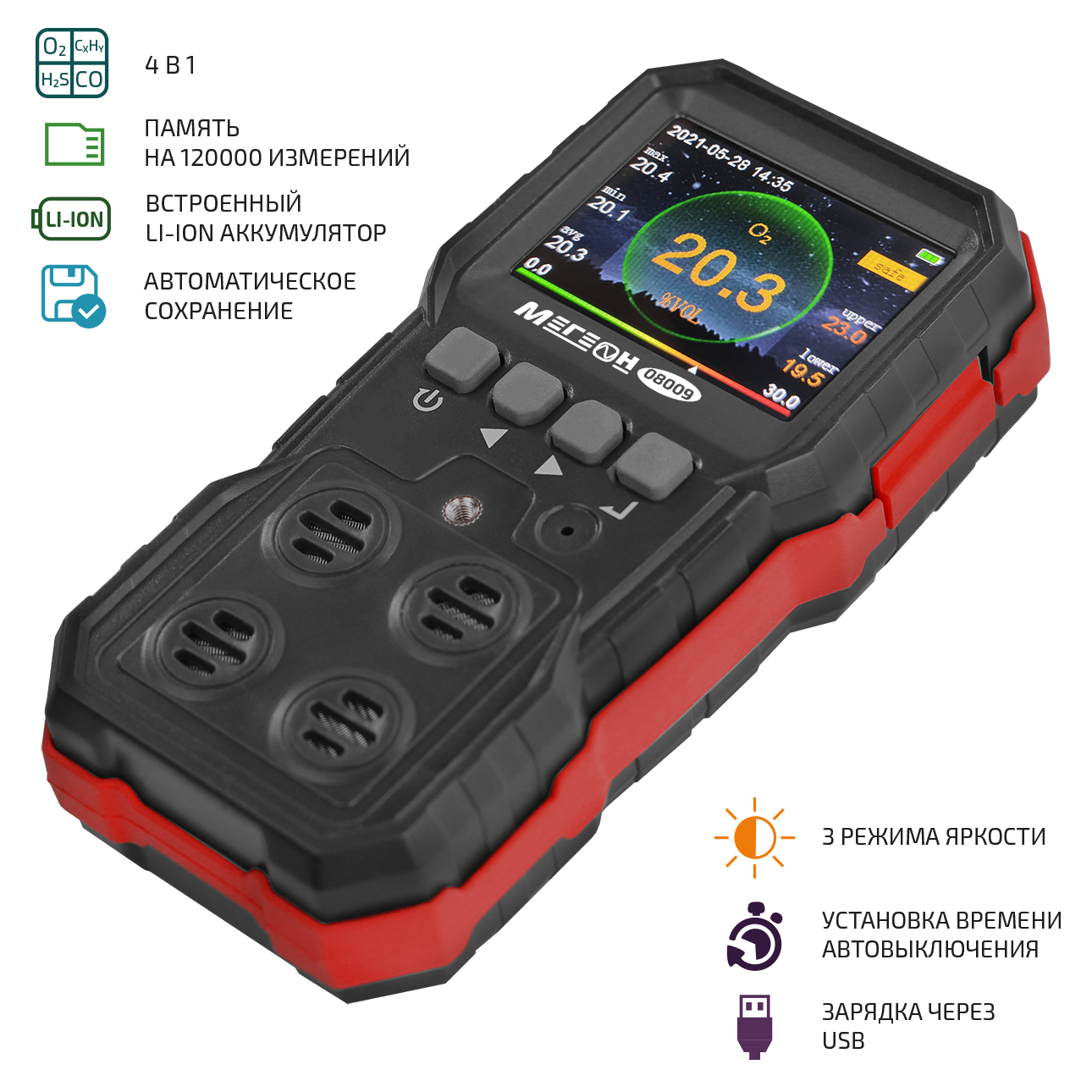МЕГЕОН 08009 – новое устройство в линейке приборов для определения концентрации газов в воздушной среде как в жилых, так и в промышленных зданиях. Этот прибор "4 в 1" объединяет в себе функции анализатора кислорода, сероводорода, горючих и монооксида углерода (угарного газа), заменяя несколько отдельных устройств.